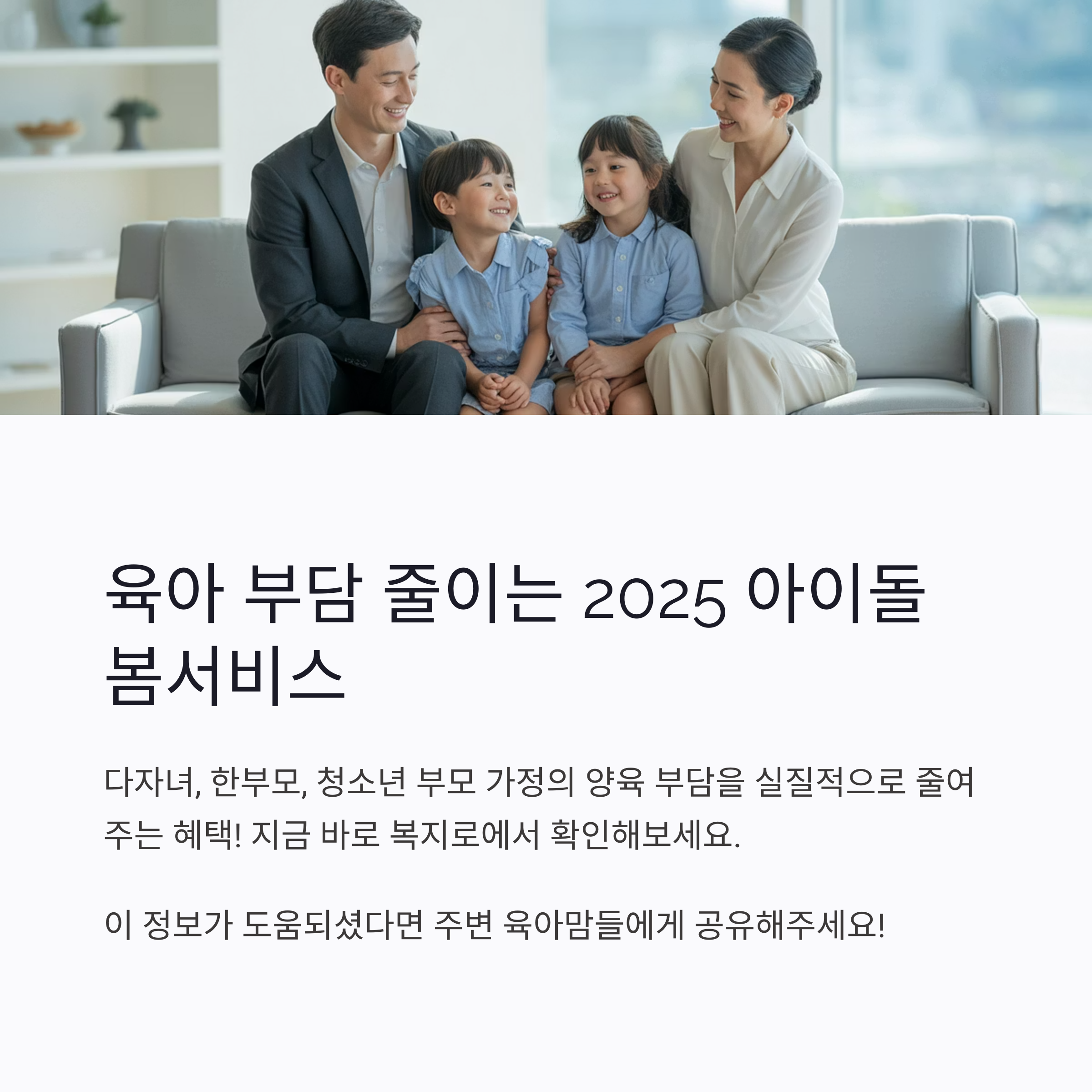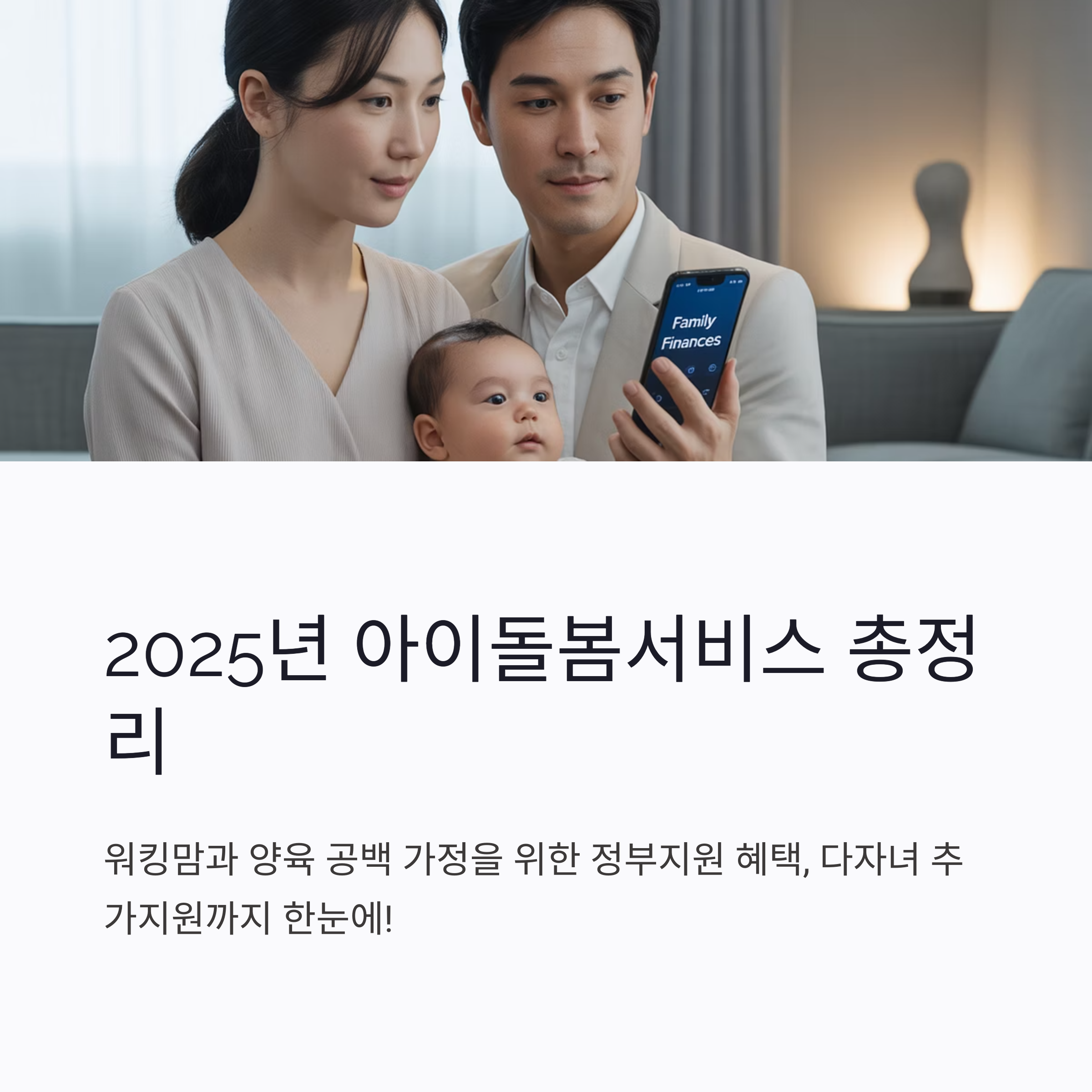 2025년 아이돌봄서비스는 다자녀, 한부모, 청소년 부모 가정의 양육 부담을 실질적으로 줄여주는 방향으로 제도 개선이 이뤄졌습니다. 지역별 혜택까지 잘 활용하면 비용 부담 없이 안정적인 돌봄 서비스를 받을 수 있습니다.