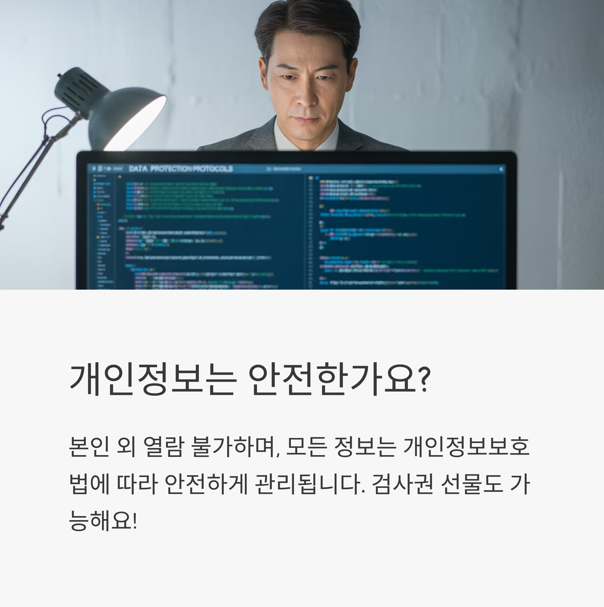 A5. 절대 아닙니다. 본인 외 열람 불가, 모든 정보는 개인정보보호법에 따라 안전하게 관리됩니다.