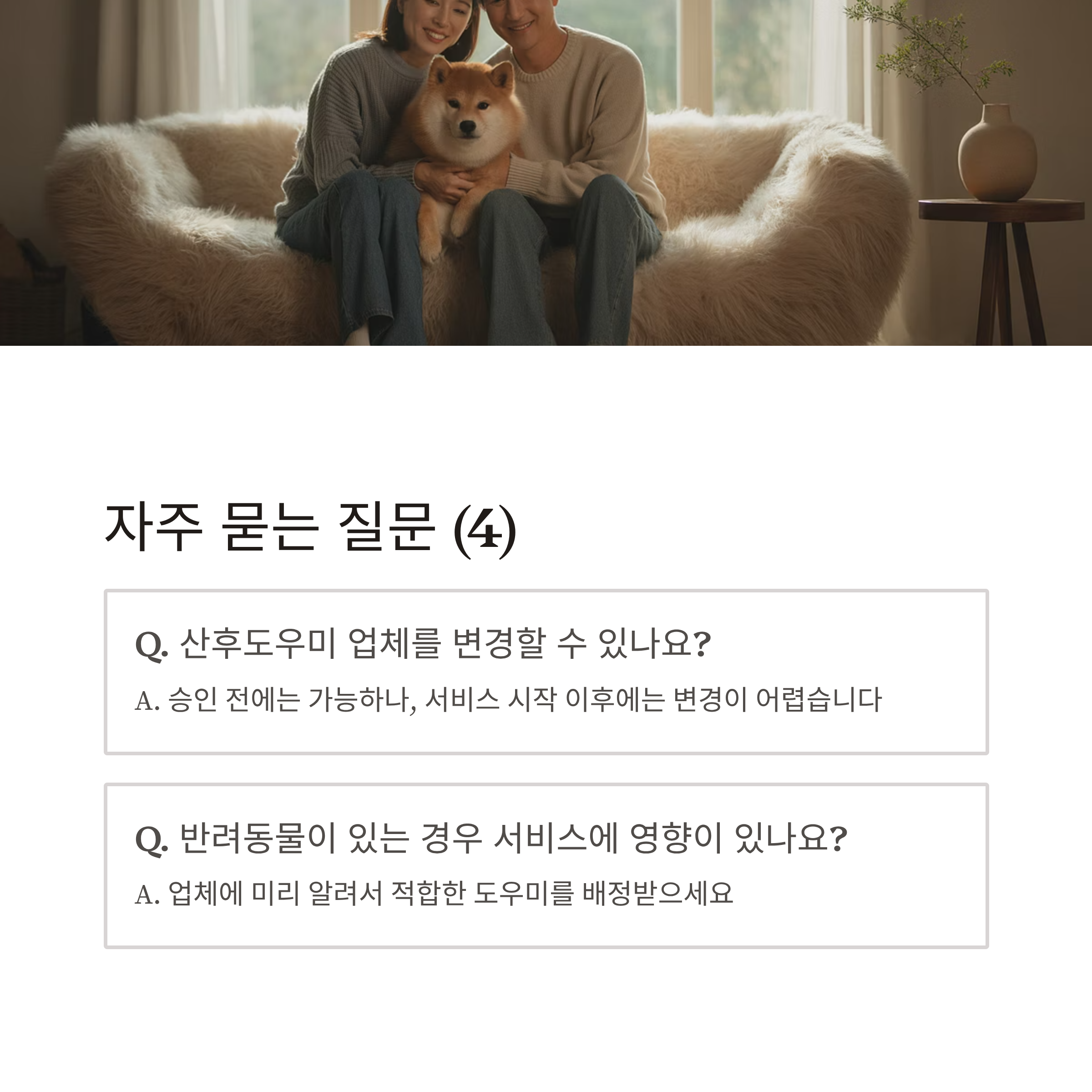 A8. 업체에 반려동물 유무를 미리 알리면, 해당 조건에 맞는 도우미를 배정받을 수 있습니다.
