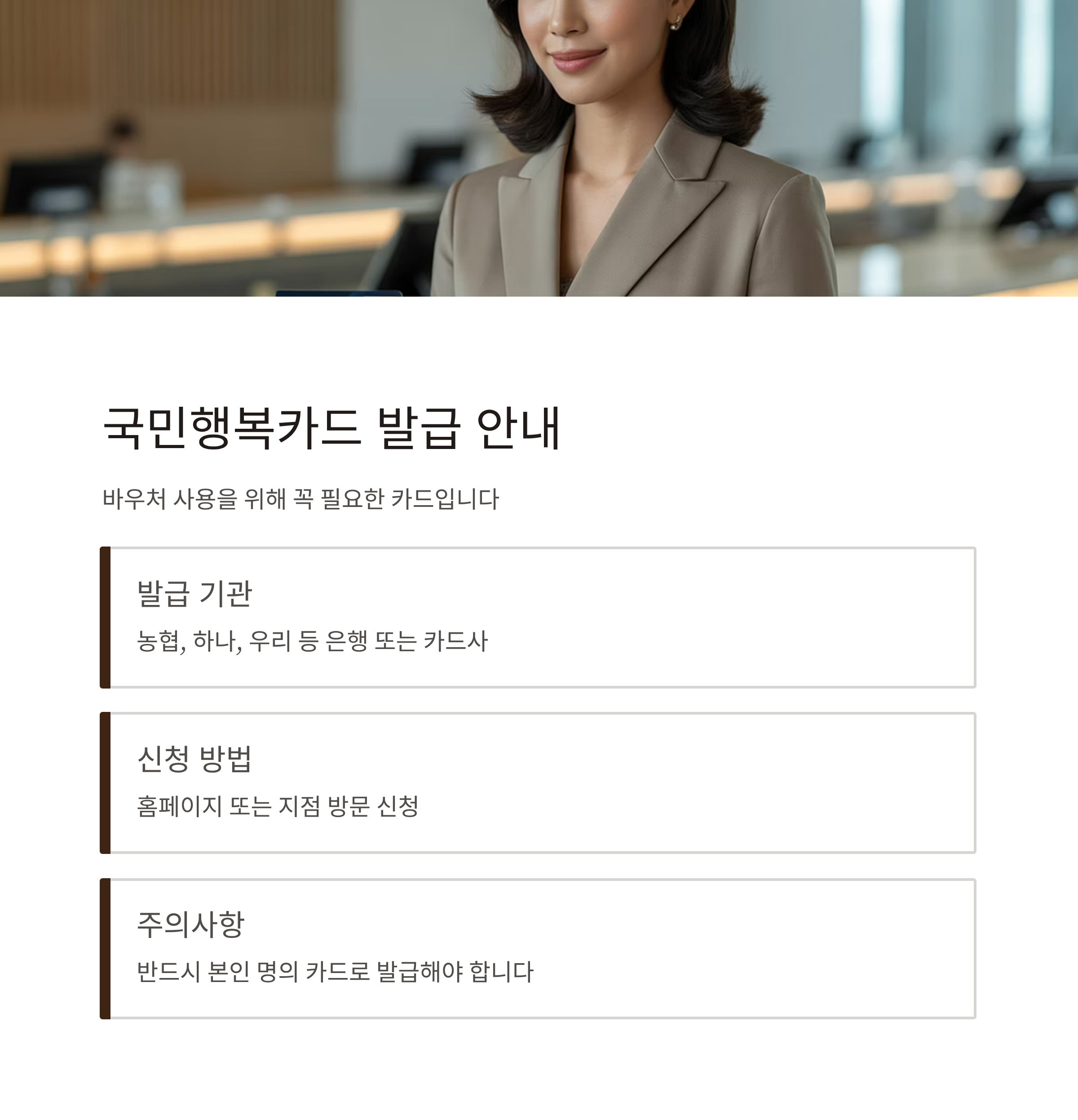 A6. 농협, 하나, 우리 등 은행 또는 카드사 홈페이지에서 신청 가능하며, 바우처 연동을 위해 본인 명의 카드가 필요합니다.