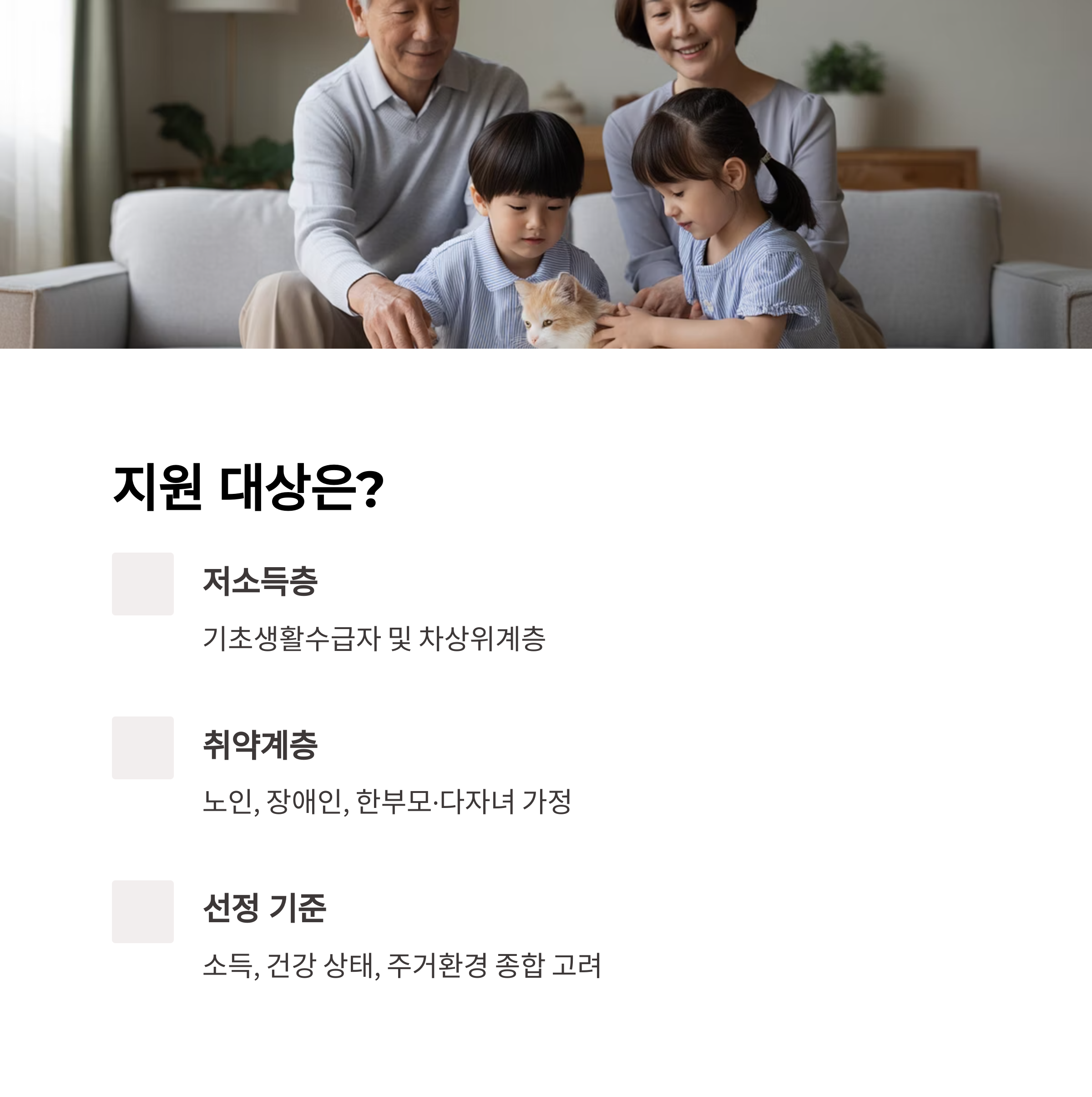 ✔ 지원 대상: 저소득층, 노인, 장애인, 한부모·다자녀 가정 등