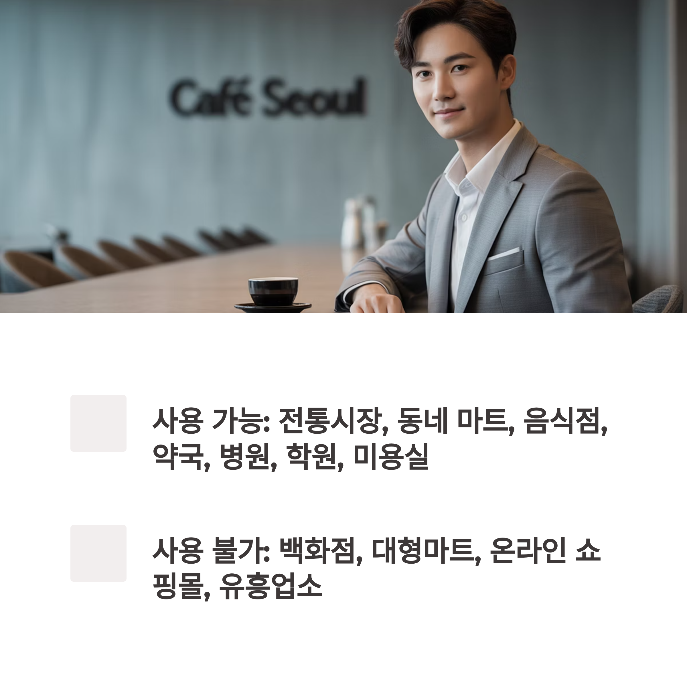 ❌ 백화점, 대형마트, 온라인 쇼핑몰, 유흥업소 사용 불가