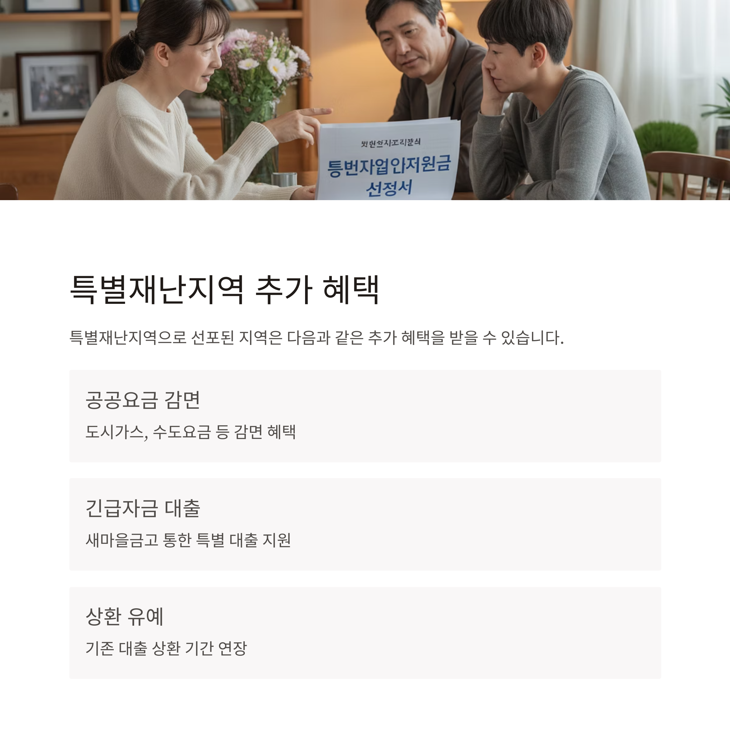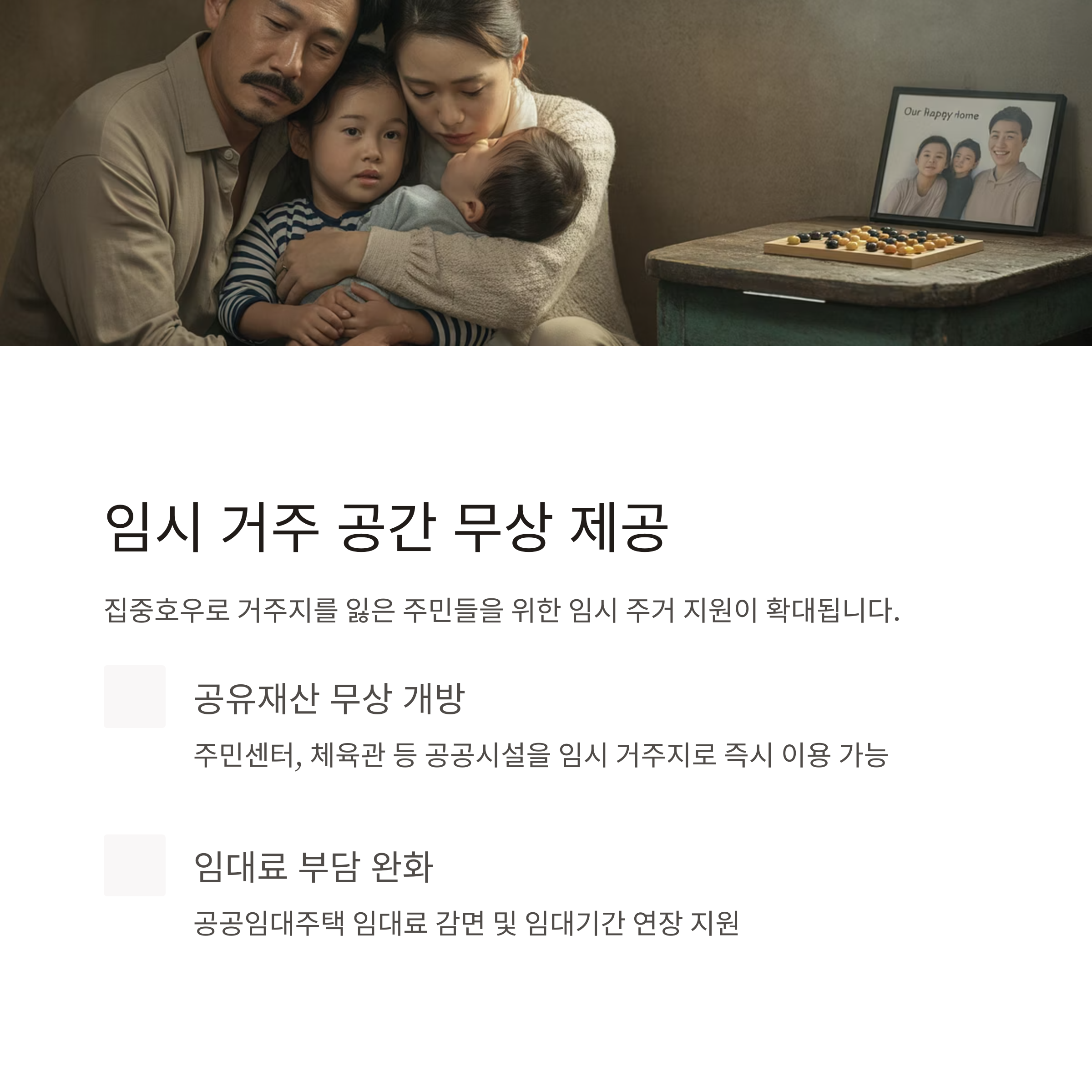 이재민의 생활비·고정지출 부담을 완화하기 위한 광범위한 공공요금 및 금융 지원이 병행됩니다.