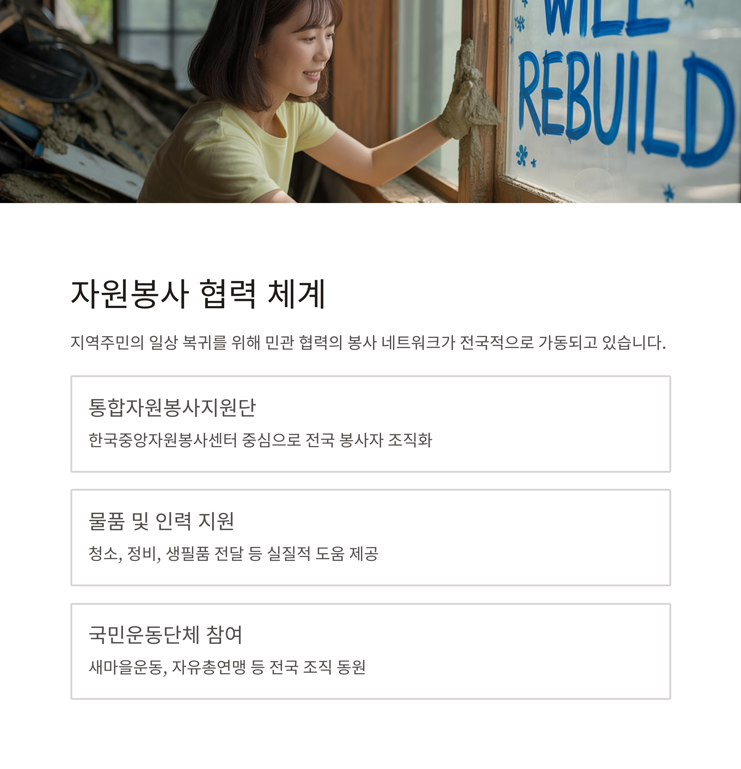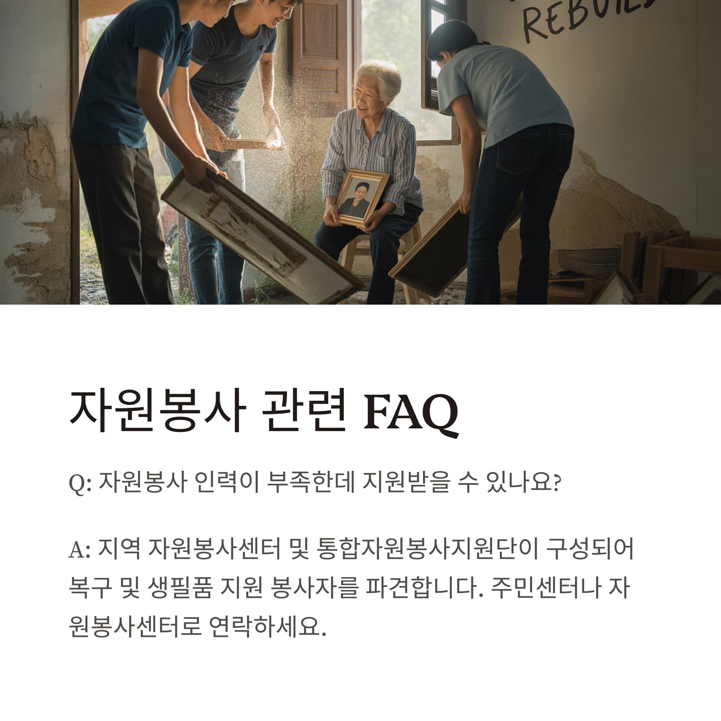 A7. 지역 자원봉사센터 및 통합자원봉사지원단이 구성되어 복구 및 생필품 지원 봉사자를 파견합니다.