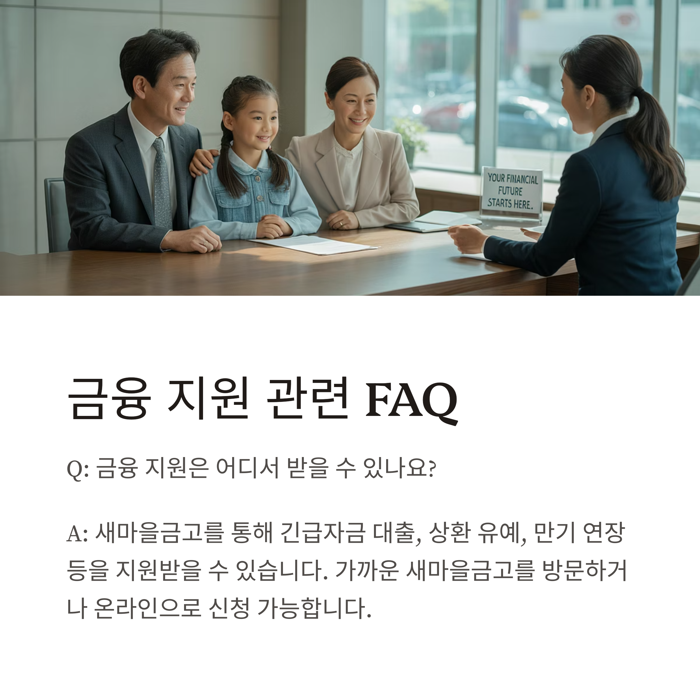 A6. 새마을금고를 통해 긴급자금 대출, 상환 유예, 만기 연장 등을 지원받을 수 있습니다.