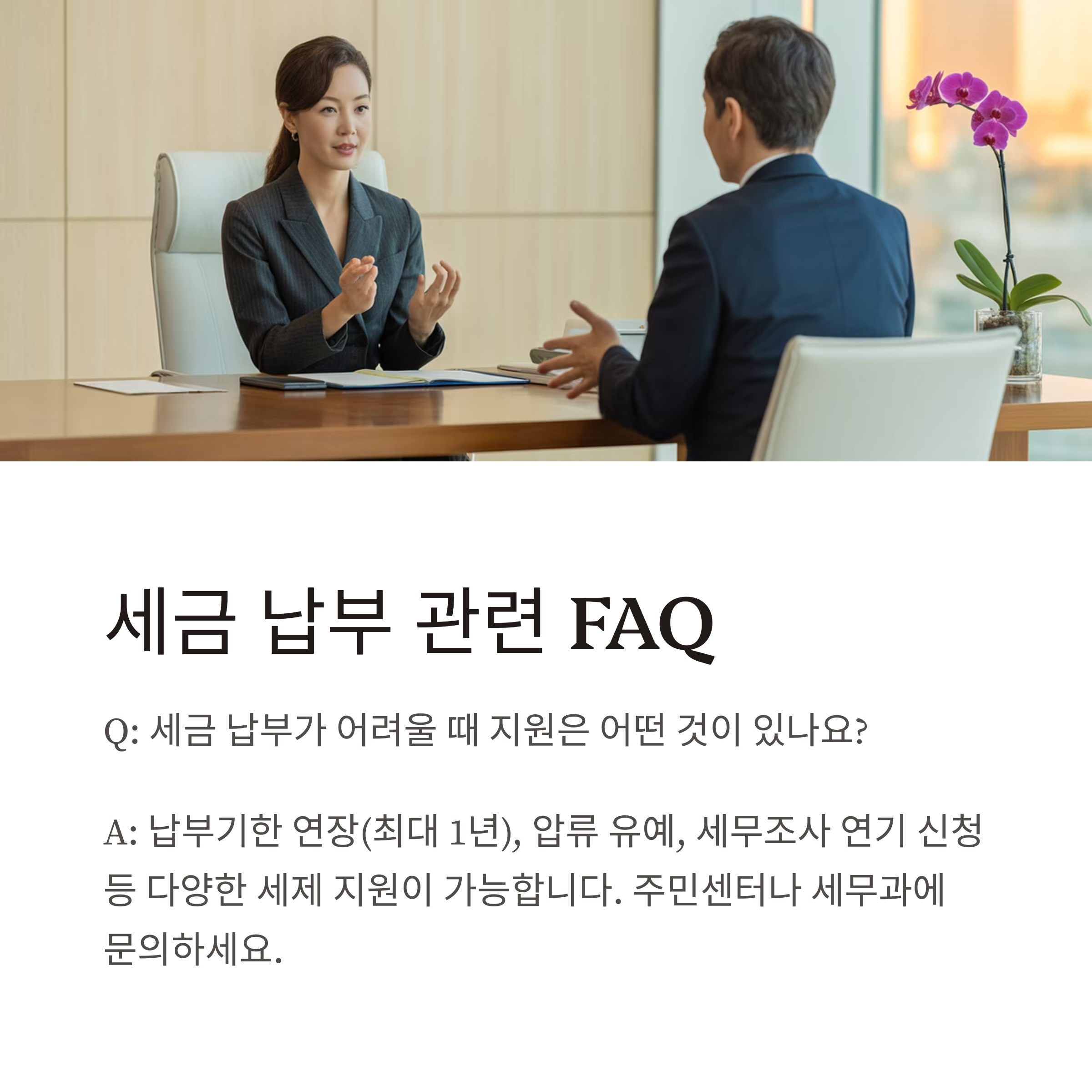 A4. 납부기한 연장(최대 1년), 압류 유예, 세무조사 연기 신청 등 다양한 세제 지원이 가능합니다.