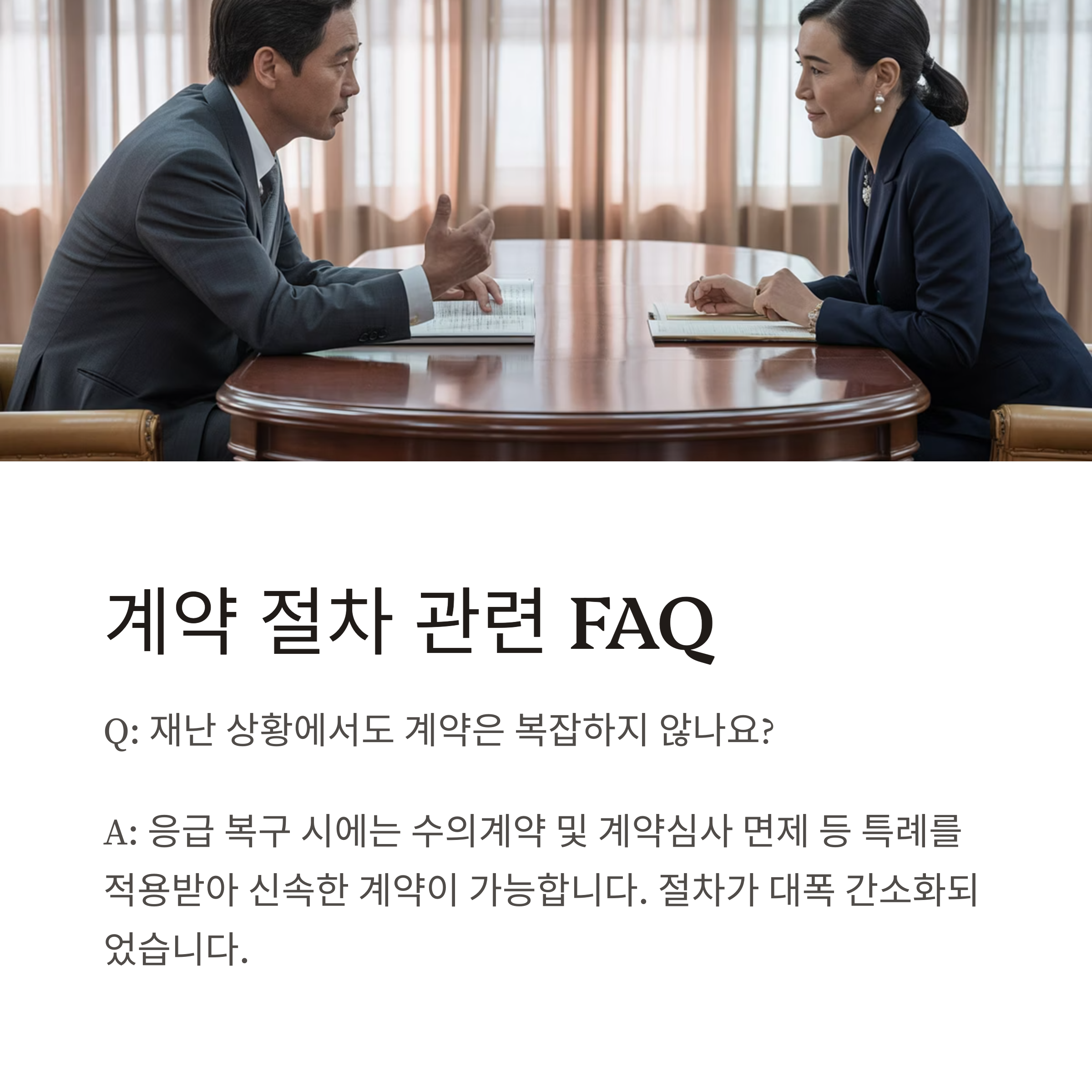 A2. 응급 복구 시에는 수의계약 및 계약심사 면제 등 특례를 적용받아 신속한 계약이 가능합니다.
