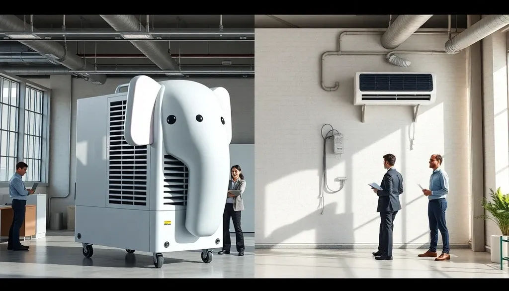 - 일반 산업용 에어컨: 고정 설치형으로 대규모 냉방에 용이하나 설치 비용과 시간이 많이 소요됨