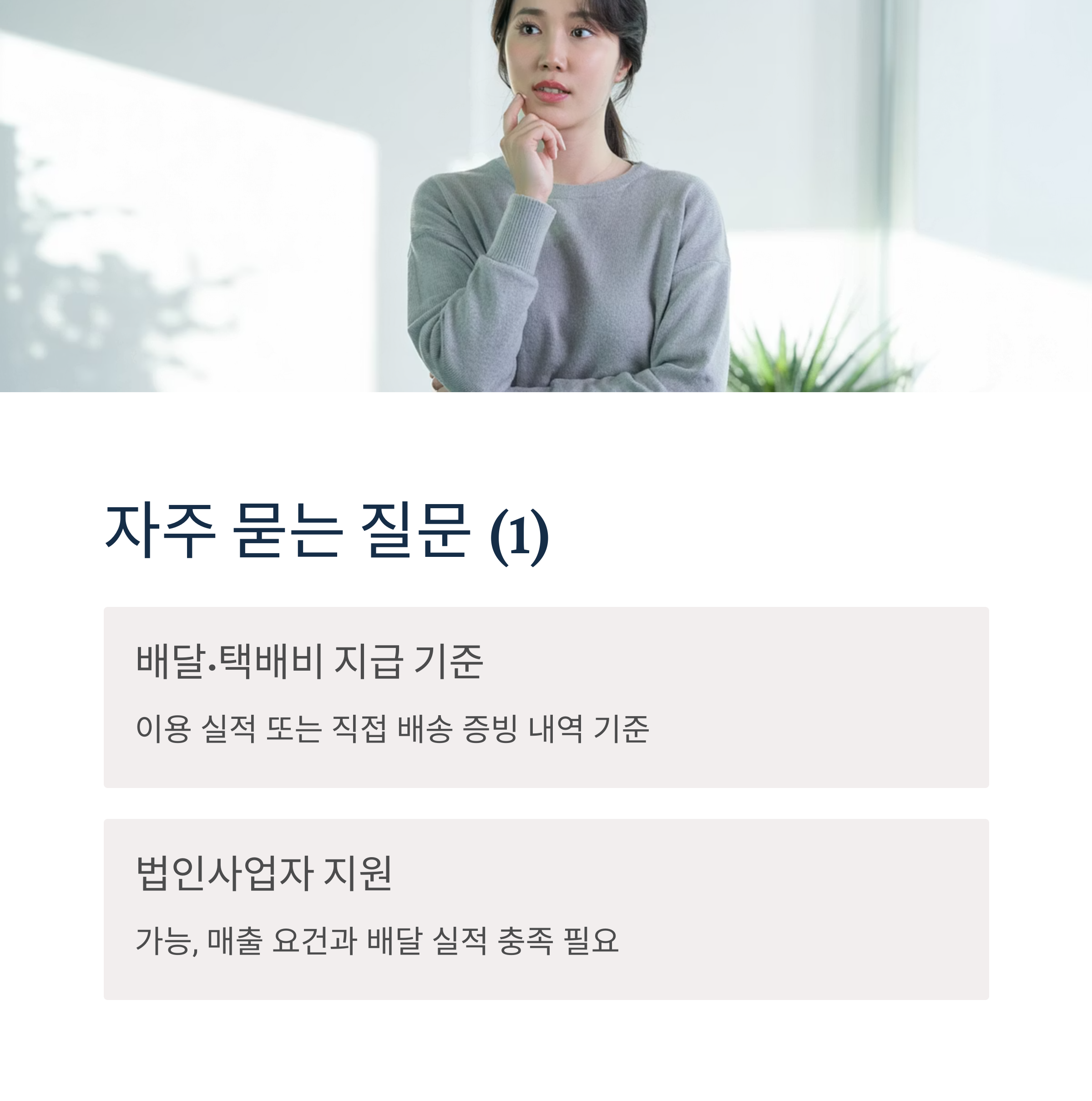 - 신속지급: 배달앱/택배 대행 이용 실적이 있는 경우, 증빙서류 없이 간편 신청 가능
