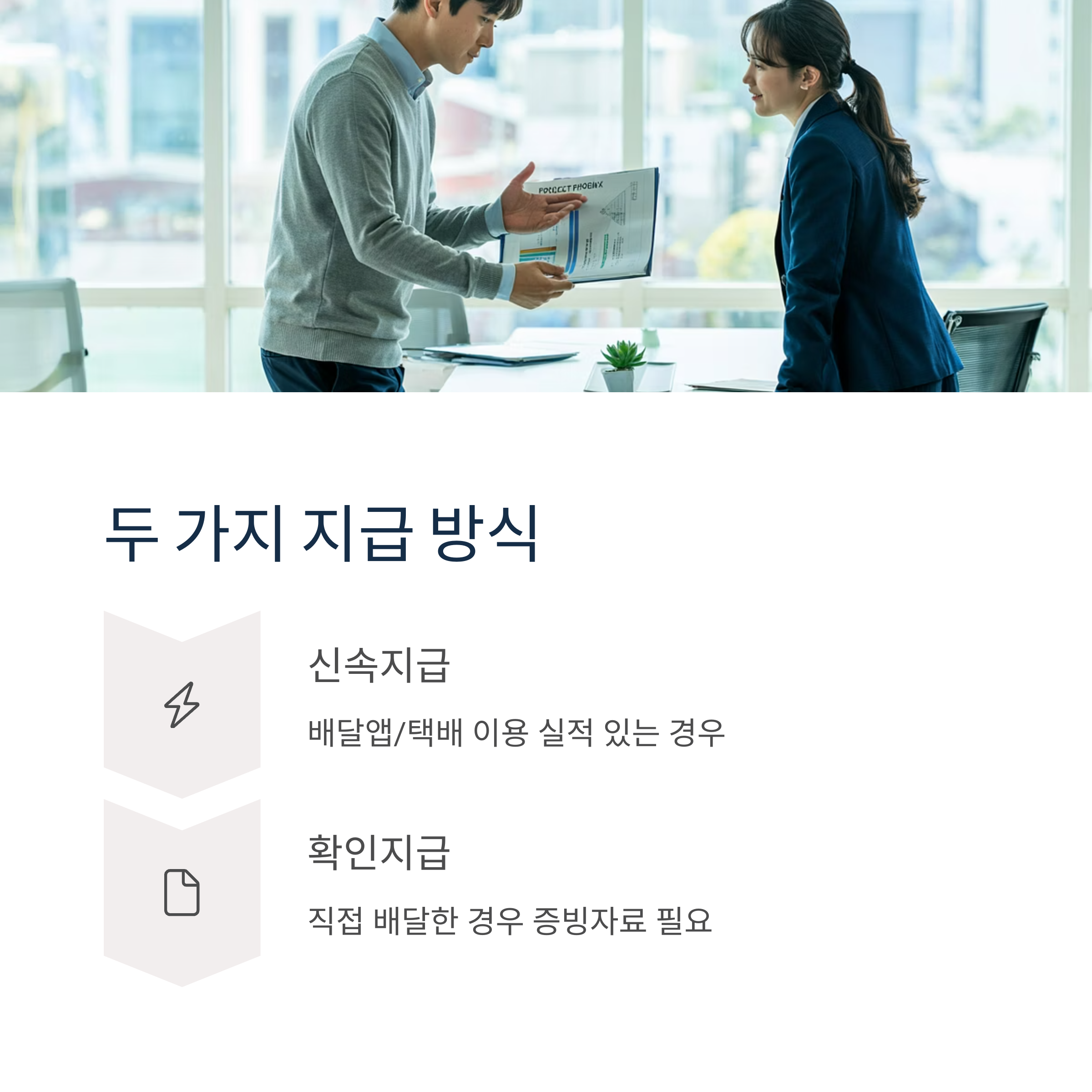 - 확인지급: 직접 배달한 경우 전자세금계산서, 운송장 등 증빙자료 필요