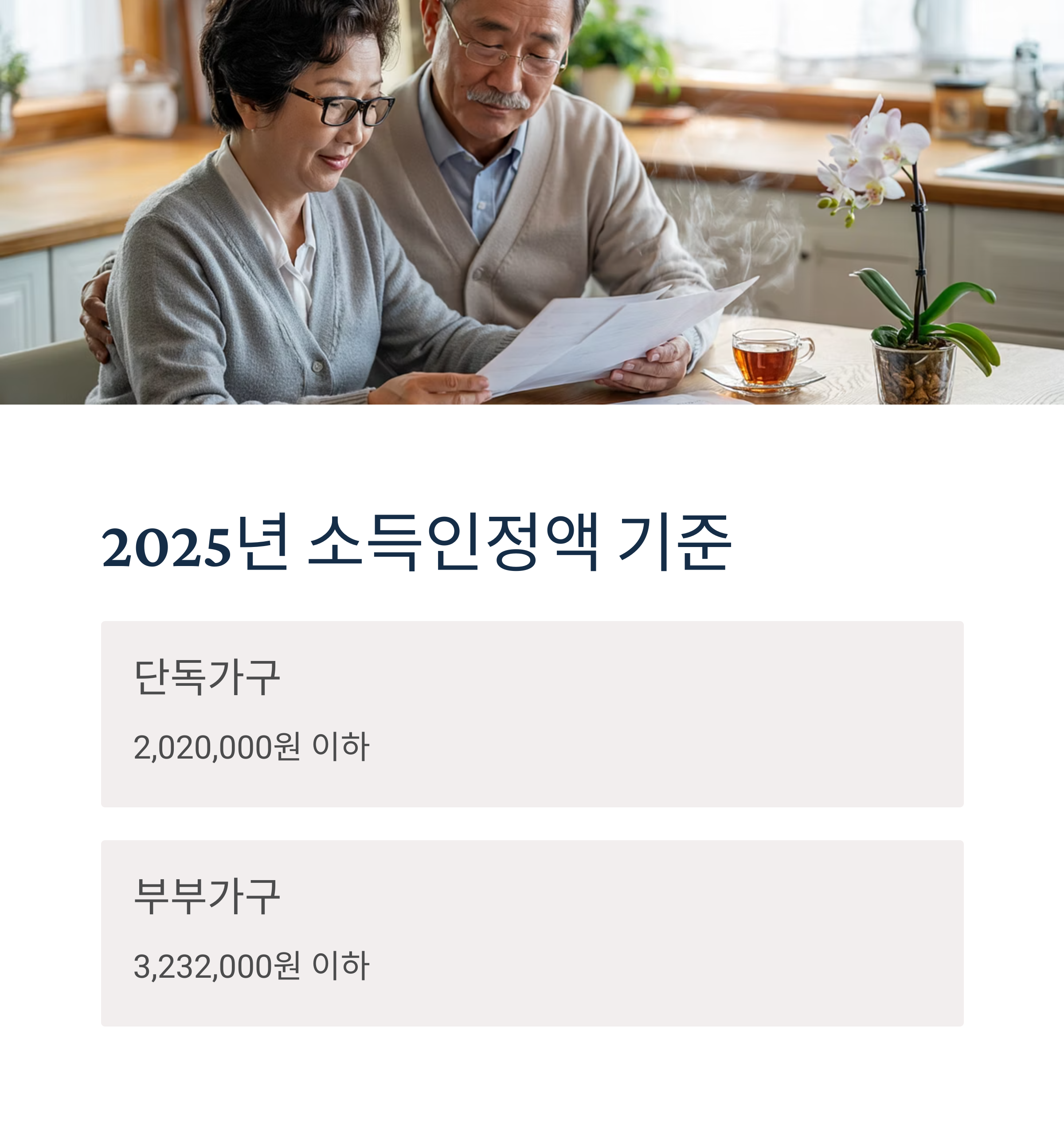 ✔ 단독가구 vs 부부가구: 기준액도 다르고, 소득과 재산은 합산 평가
