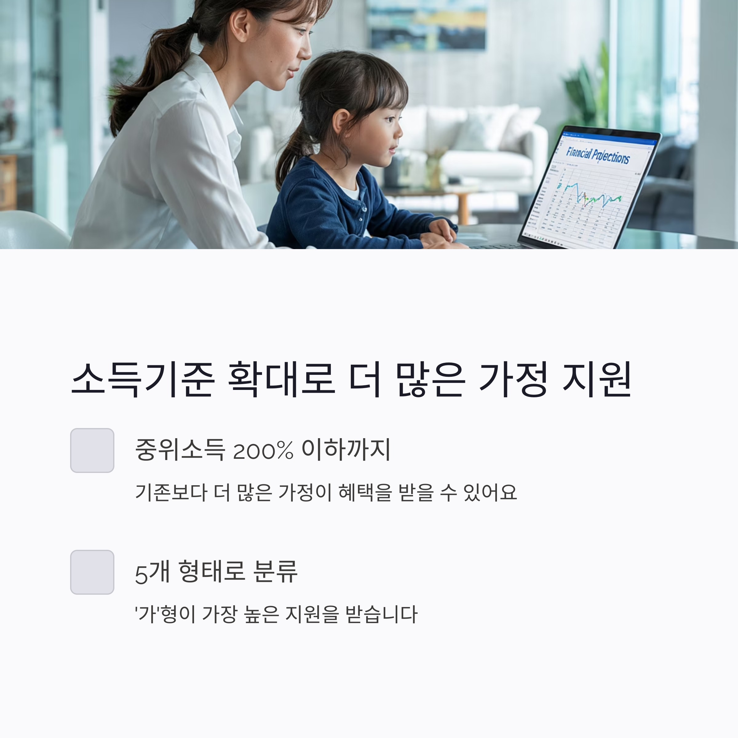 A1. 기준 중위소득 200% 이하 가구까지 확대되었으며, 기존보다 더 많은 가정이 혜택을 받을 수 있어요.