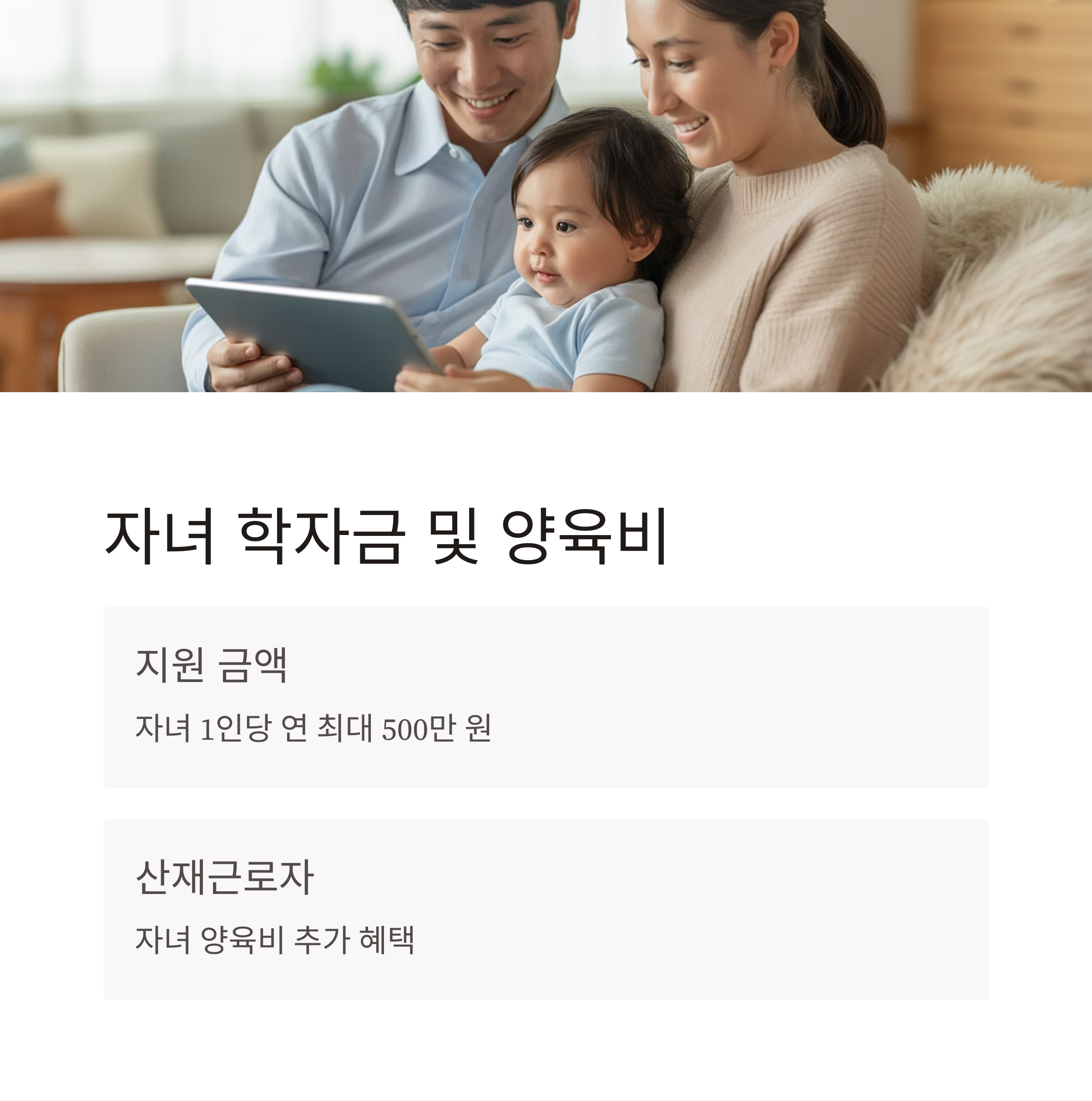 ▶ 특히 산재근로자는 자녀 양육비까지 추가로 받을 수 있어 실질 혜택이 확대되었습니다.