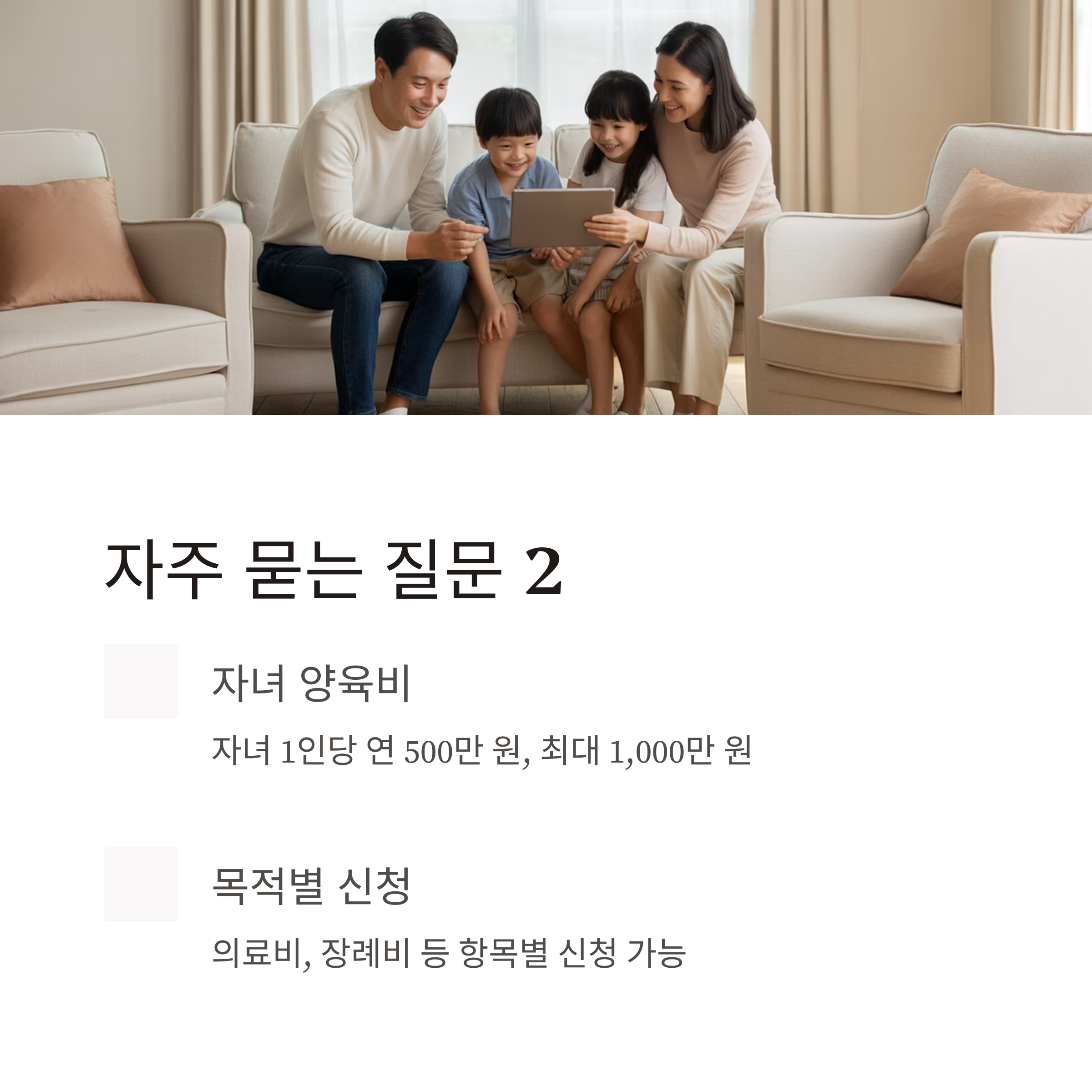 ✔ 자녀 학자금 및 양육비: 자녀 1인당 연 최대 500만 원