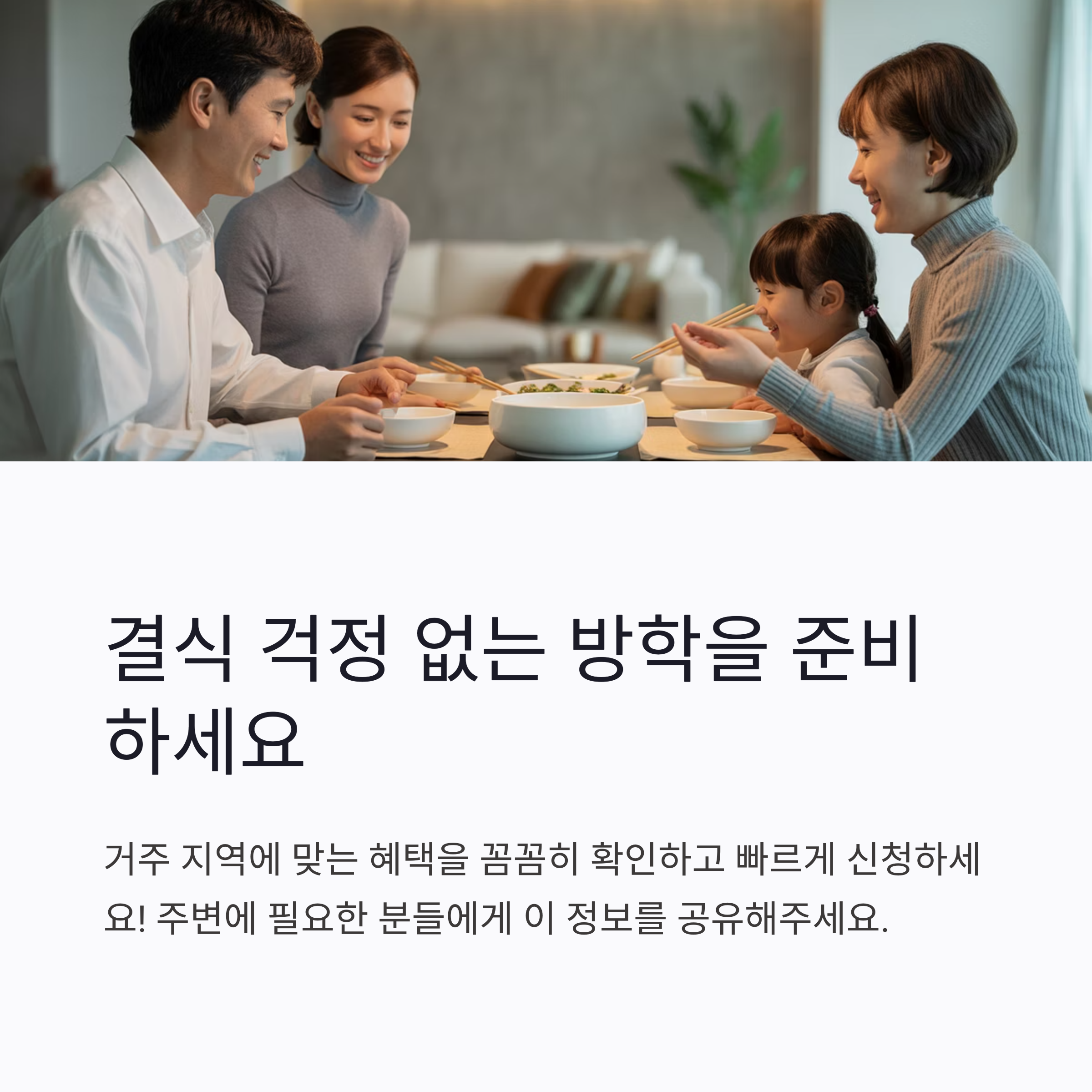 거주 지역에 맞는 혜택을 꼼꼼히 확인하고 빠르게 신청하여 결식 걱정 없는 방학을 준비하세요!