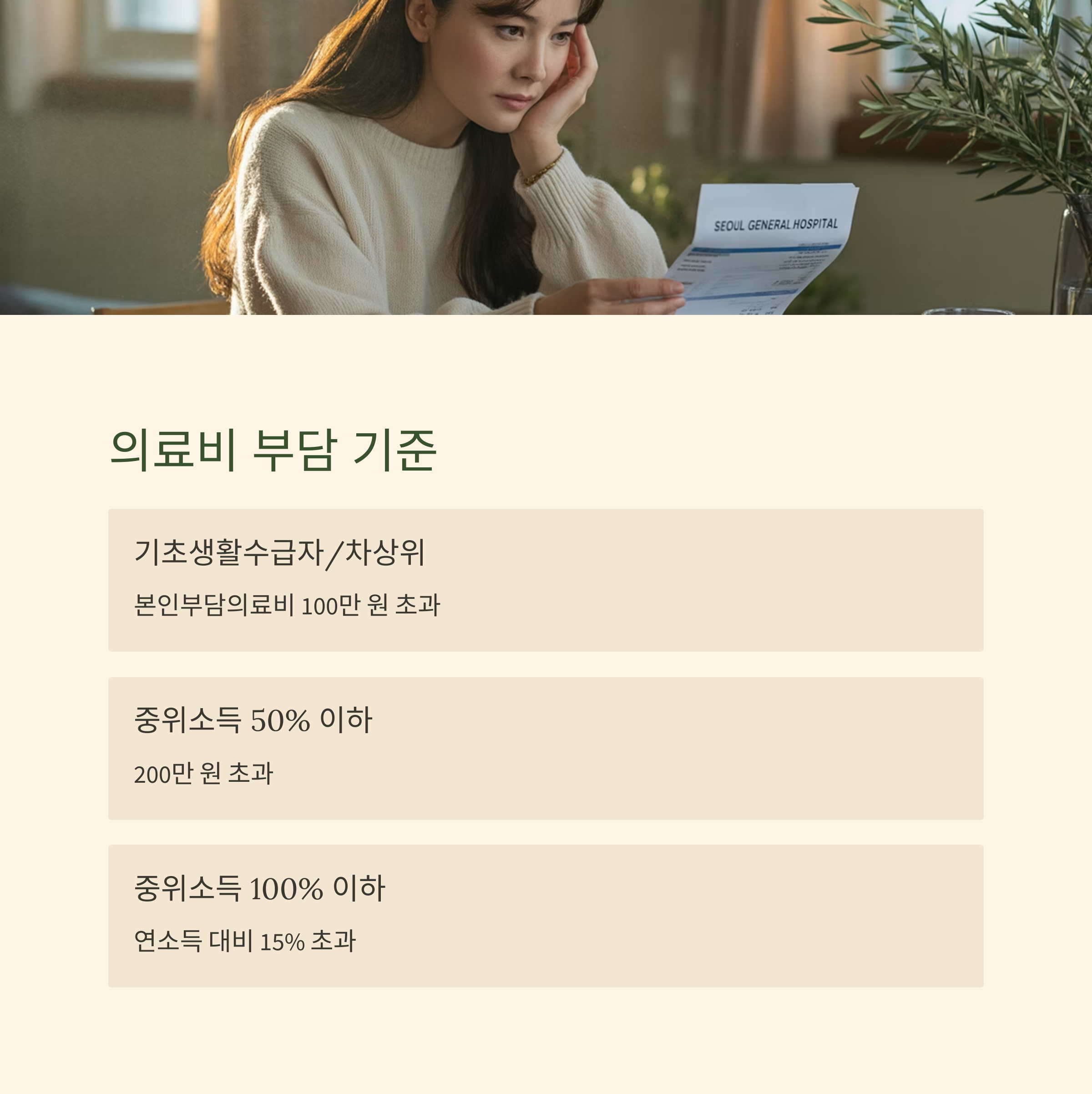 갑작스러운 질병이나 사고로 과도한 의료비가 발생한 가구에 대해 국가가 의료비 일부를 지원하는 제도입니다.