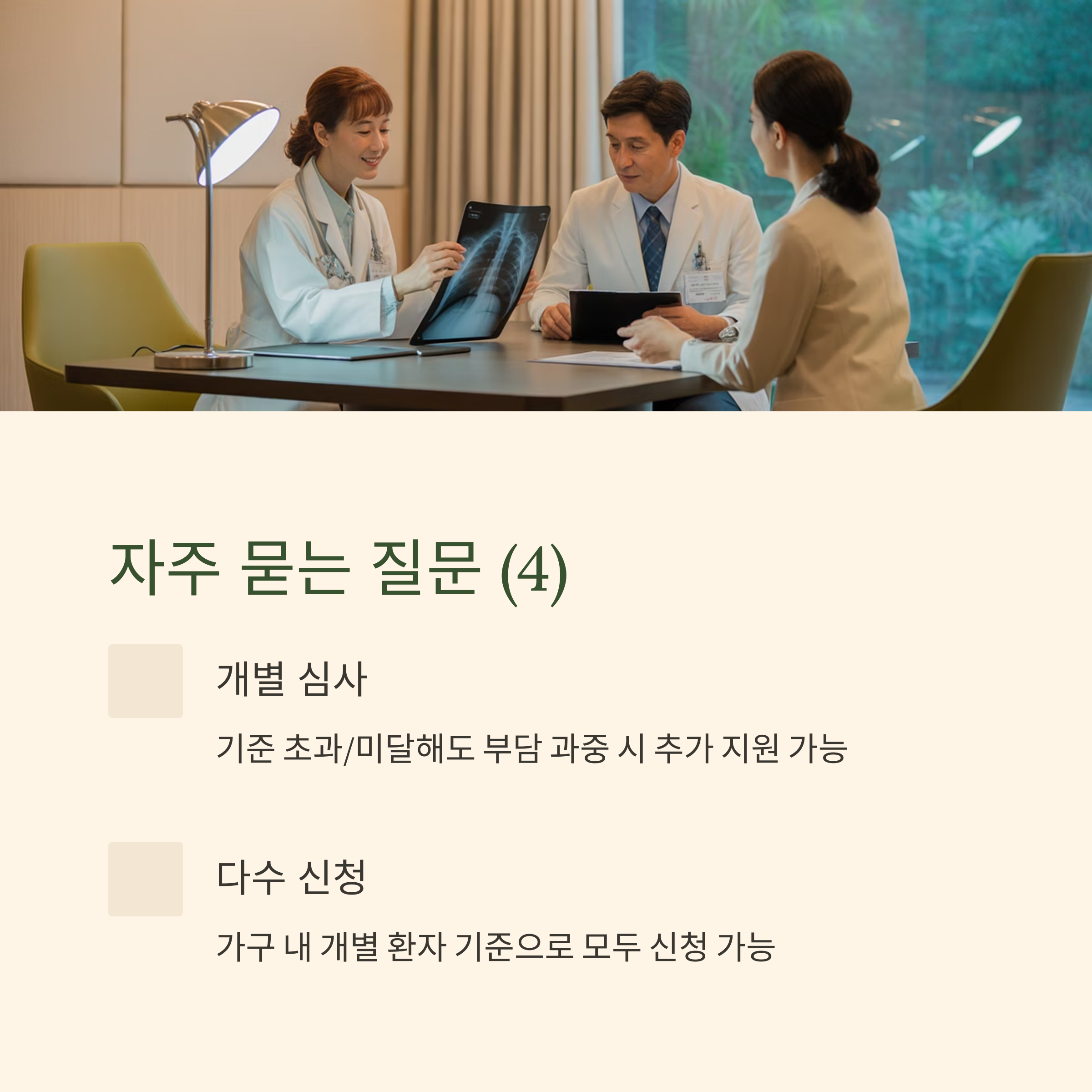 A7. 기준을 약간 초과하거나 미달해도 의료비 부담이 과중한 경우 추가 지원을 받을 수 있습니다.