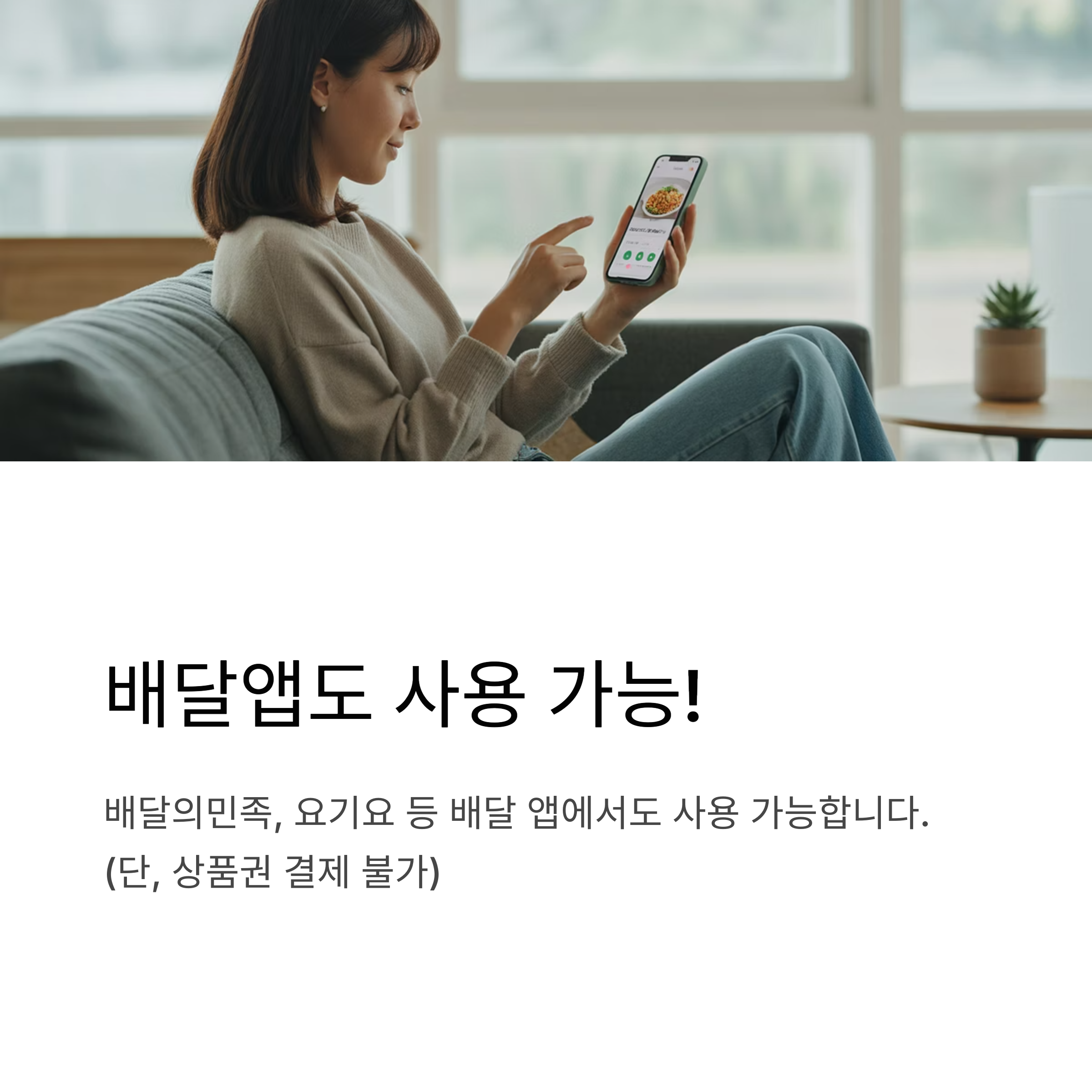 ✔ 배달의민족, 요기요 등 배달 앱 (단, 상품권 결제는 불가)